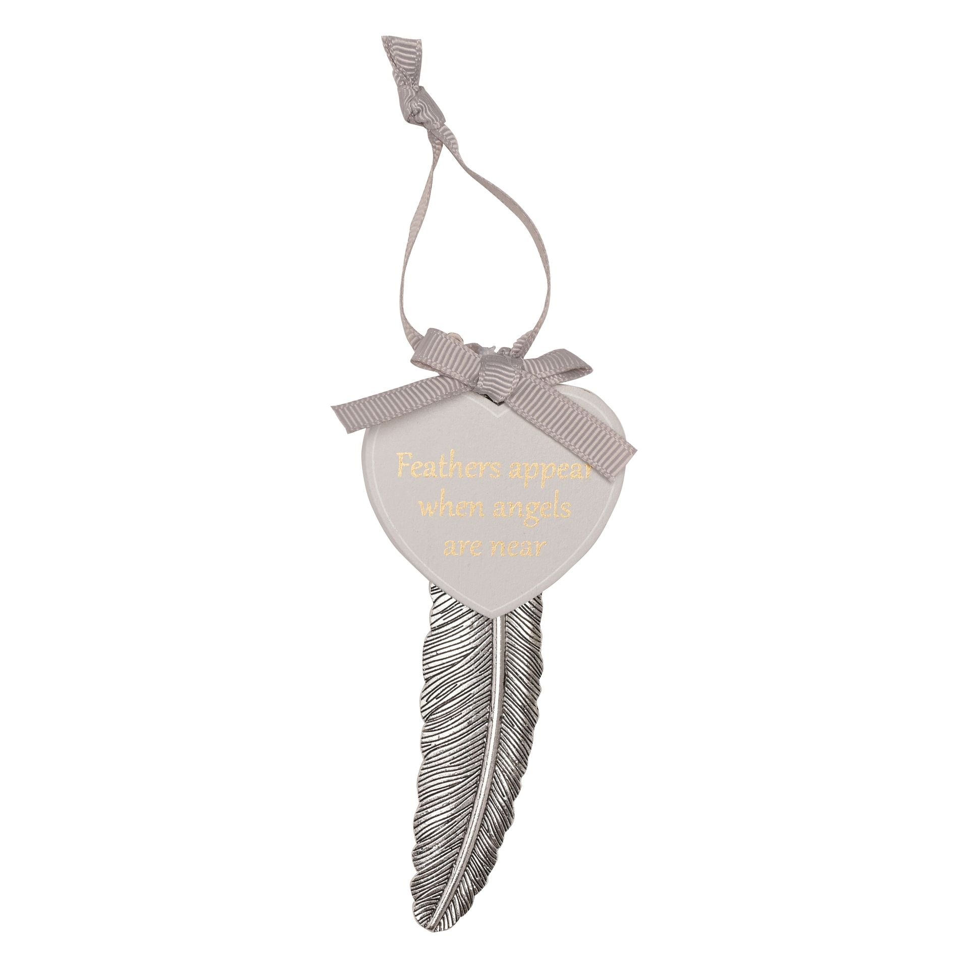 Das weiße Holzherz ist mit dem goldenen Spruch „Feathers appear when angels are near“ (Federn erscheinen, wenn Engel in der Nähe sind), einer Metallfederverzierung und einer silbernen Bandschleife verziert. Es wird an einem passenden Bandaufhänger aufgehängt.